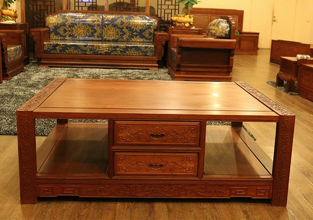 其他幾個(gè)部件:二人座長(zhǎng)沙發(fā)處之紋飾設(shè)計(jì)以及大體形態(tài)與單人座沙發(fā)大致保持了一致;而在高幾部分,除牡丹花紋飾外另還能看見(jiàn)的還有元寶圖案雕飾,雕繪于上方抽屜層面左右前方位置處,意帶有“滾滾財(cái)源”“吉祥富貴”之寓意;同樣在大平幾位置的紋飾也同高幾一同,而平滑顯著淡雅光澤的桌面更覺(jué)舒適。