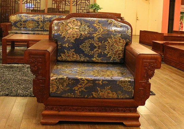 接下來(lái)我們來(lái)看看沙發(fā)各處的具體細(xì)節(jié),遠(yuǎn)看單人座沙發(fā)整體給人的感覺(jué)就好比一含苞待放鮮艷嬌貴的花朵,木質(zhì)構(gòu)造處的座椅面顯得十分地低矮,以及加上高度近乎不計(jì)的椅腳設(shè)計(jì),使之整座沙發(fā)的氣韻更顯柔美婉約;左右“兩片”向外伸展而開(kāi)的扶手就好比那光艷的花瓣一般,給人以無(wú)限的遐思,正前方處象征著“富貴”之氣的牡丹浮雕紋飾脫穎而出,雕刻紋理處理溫柔細(xì)膩清晰,盛開(kāi)在沙發(fā)座椅的前方,顯得極為秀麗惹目;沙發(fā)最上端部分的靠背板呈現(xiàn)以一“凸”字形設(shè)計(jì),拐角處處理圓潤(rùn)平滑,而在其前方位置處也還另雕繪有一欄邊幅牡丹花紋,走筆于其板面邊緣,綿延而浮縷于不絕,富貴嬌艷。最后再說(shuō)說(shuō)沙發(fā)的背面部分,一框整而平易的木面之上,內(nèi)嵌有一“H”型字母形狀的邊幅,正中央方形位置內(nèi)還幅畫(huà)有一圓形的牡丹花卉紋飾,大略也呈上下對(duì)稱(chēng)分布,而在其方形木面的下方,也還雕飾有些許鏤空留余的一朵大牡丹紋飾,上下兩處雕飾與整體沙發(fā)所要闡述的“富貴”主題風(fēng)格所暗合,花開(kāi)富貴。